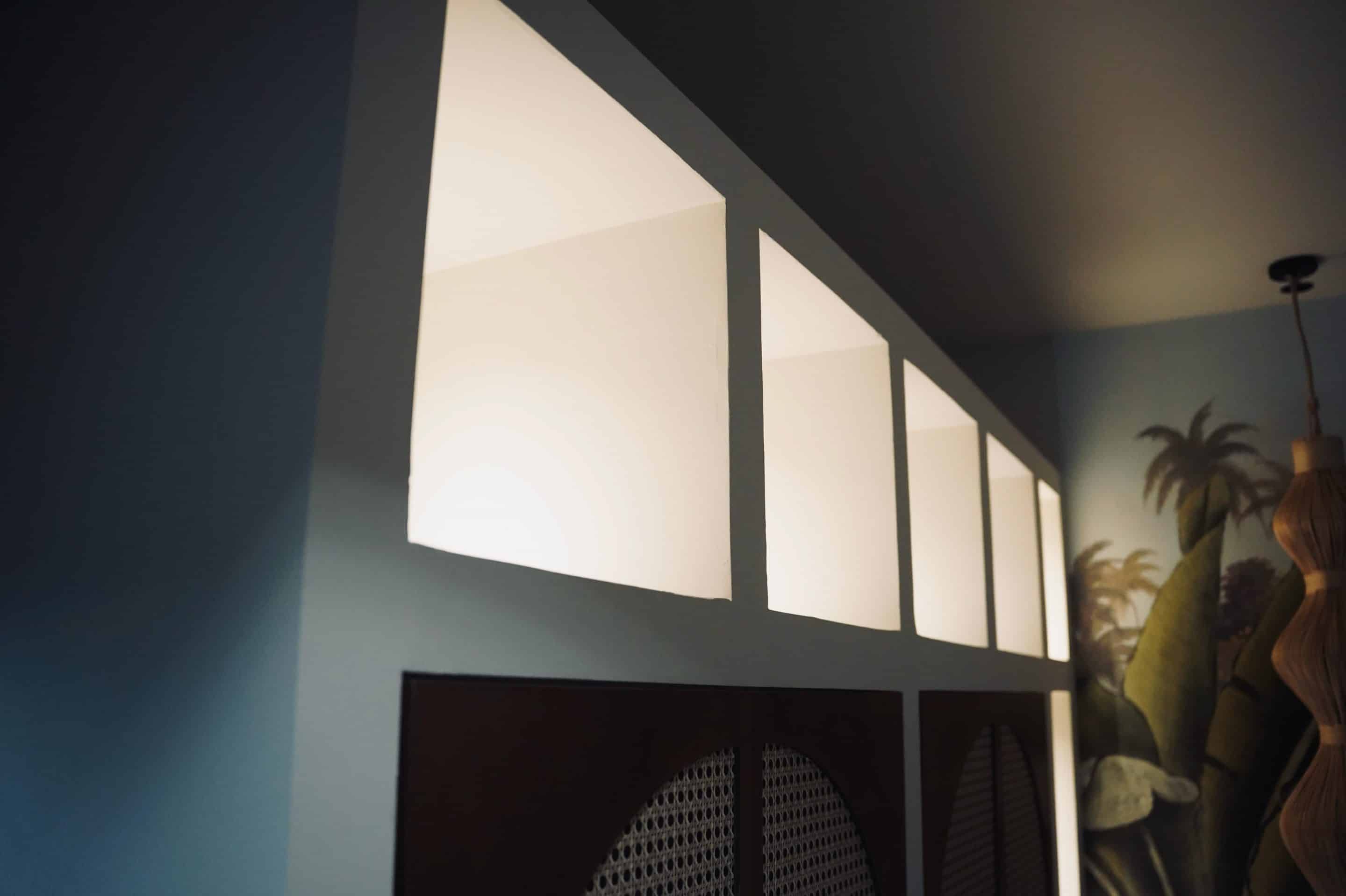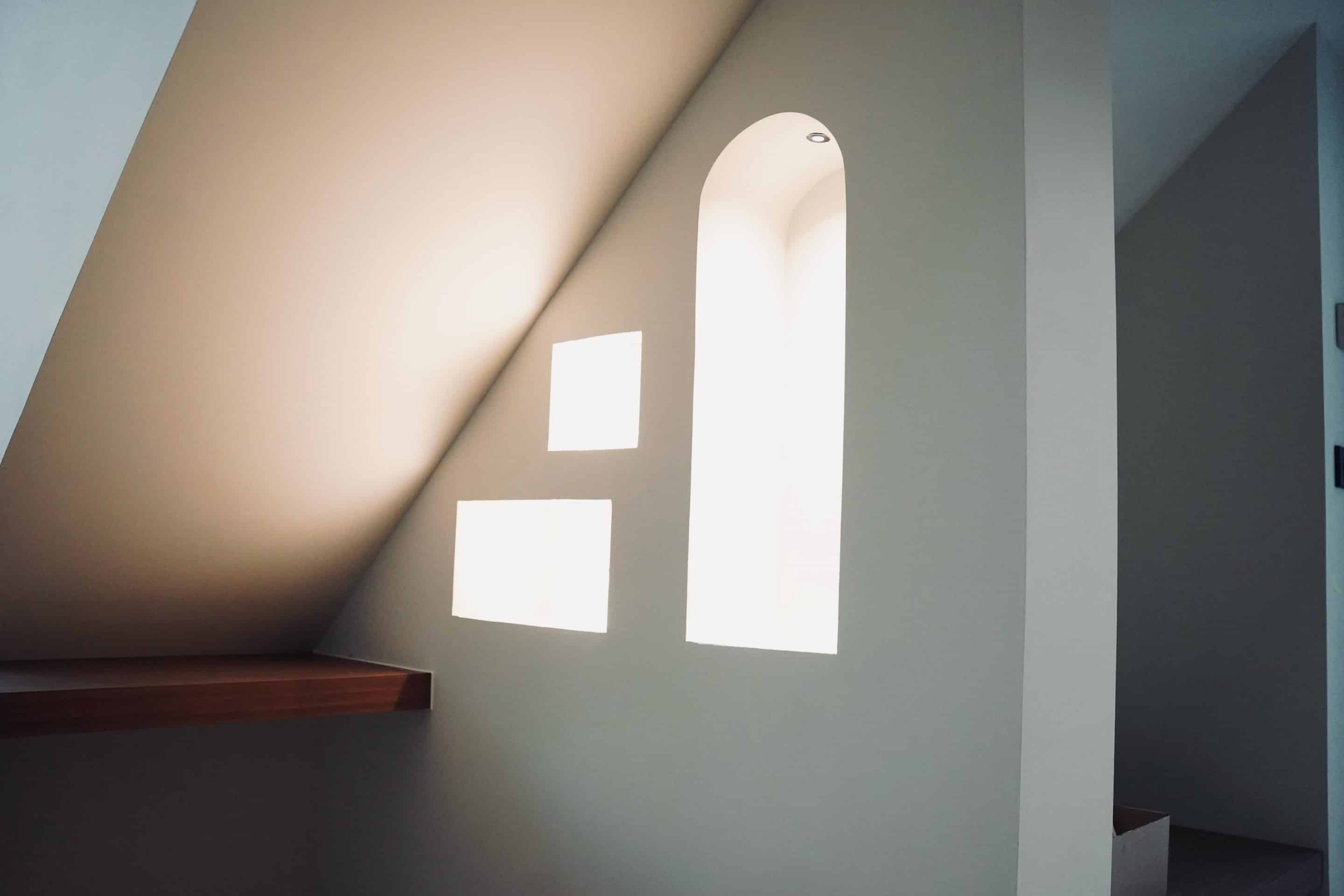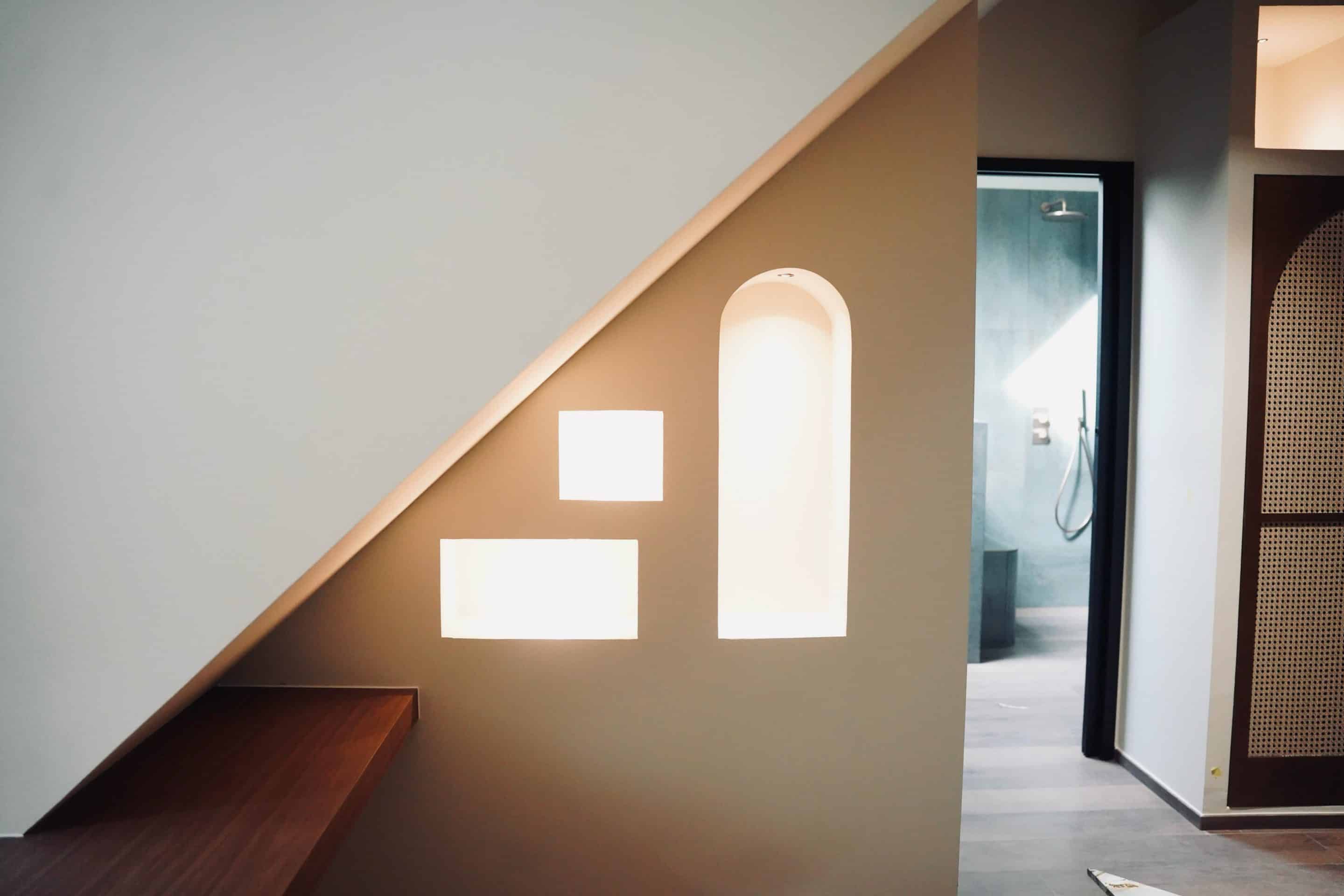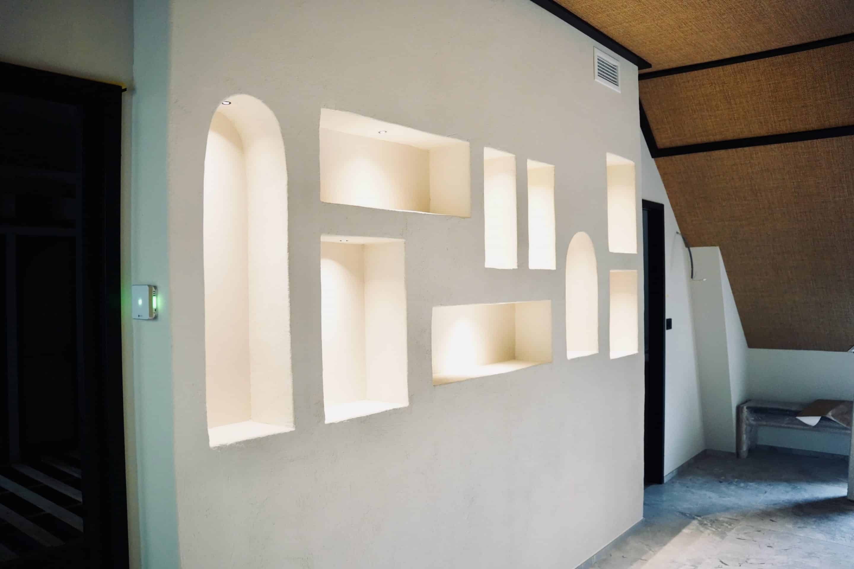 Dès la conception, l’objectif était clair : utiliser les niches en plaques de plâtre pour structurer l’espace, rythmer les murs et accompagner les perspectives, notamment sous les rampants. Chaque ouverture – carrée, rectangulaire ou en arc – a été pensée comme un petit cadre lumineux, capable d’accueillir objets déco ou simplement de dessiner la lumière.