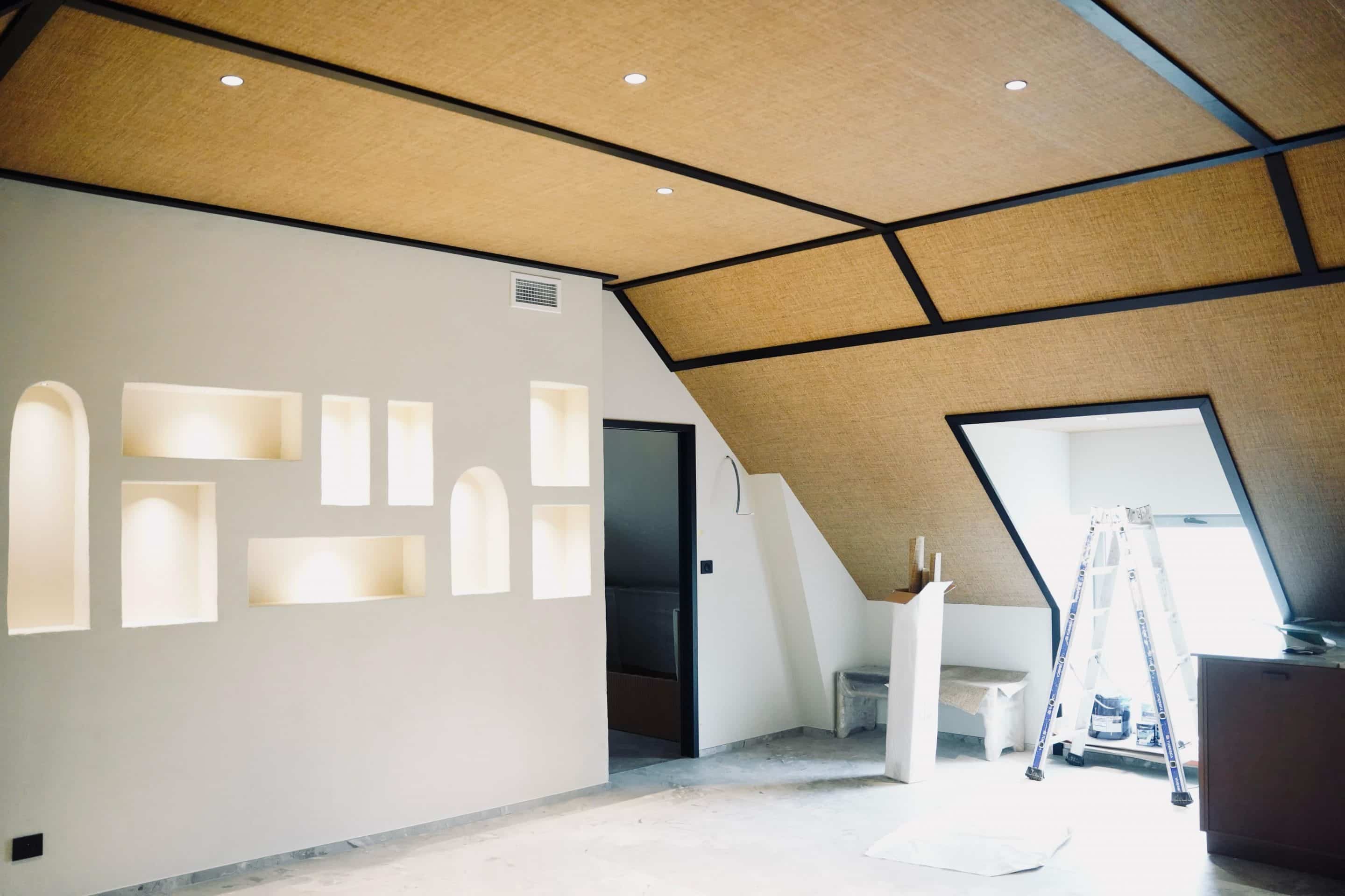 Sur ce projet, notre équipe de plaquistes a dû composer avec des contraintes architecturales fortes : combles, pentes, angles, intégration des réseaux et de l’éclairage. Traçage précis, ossature métallique soignée, mise en œuvre des plaques, traitement minutieux des joints et des arrêtes ont permis d’obtenir des niches parfaitement alignées, aux courbes régulières et aux retours propres.