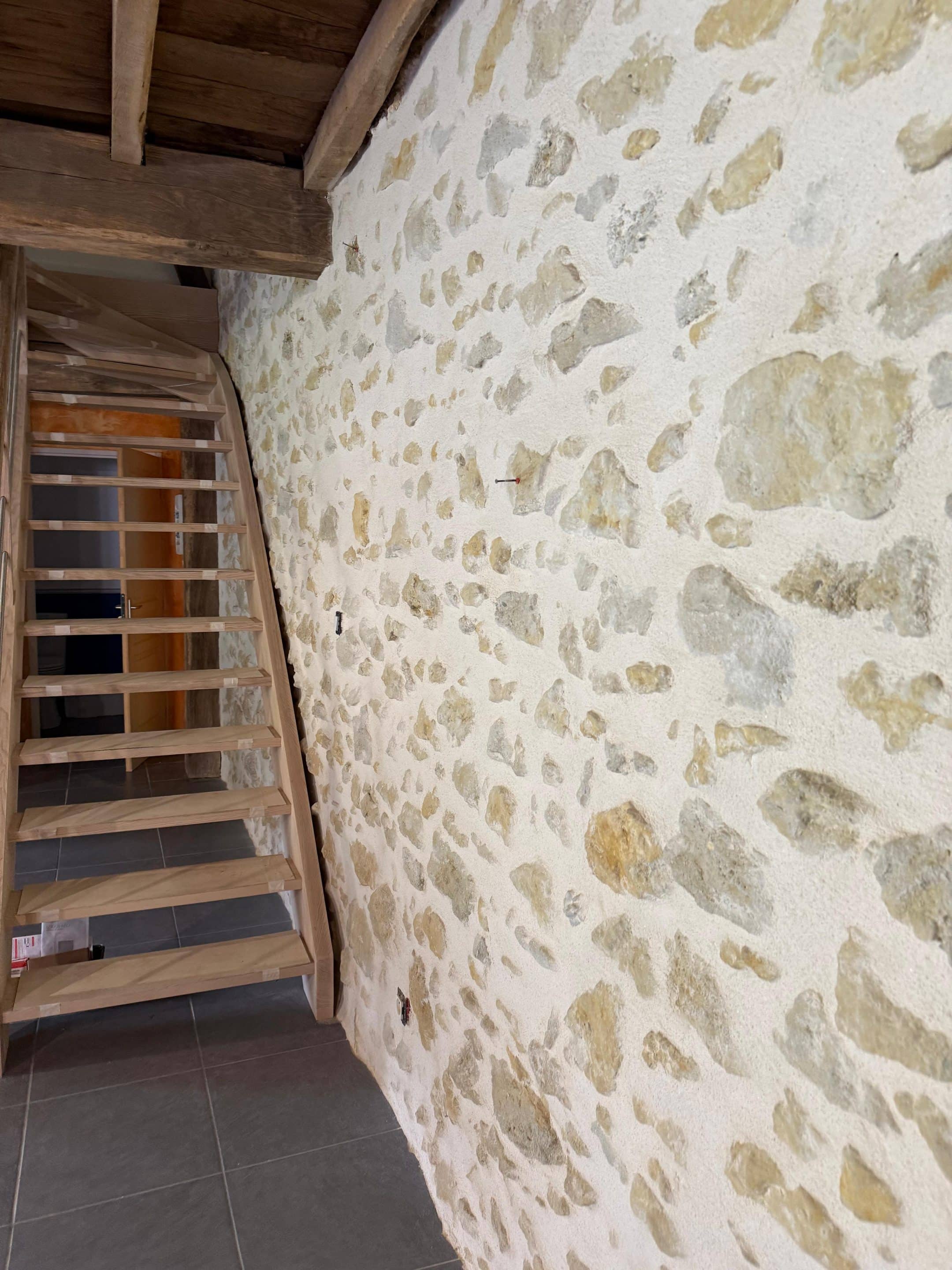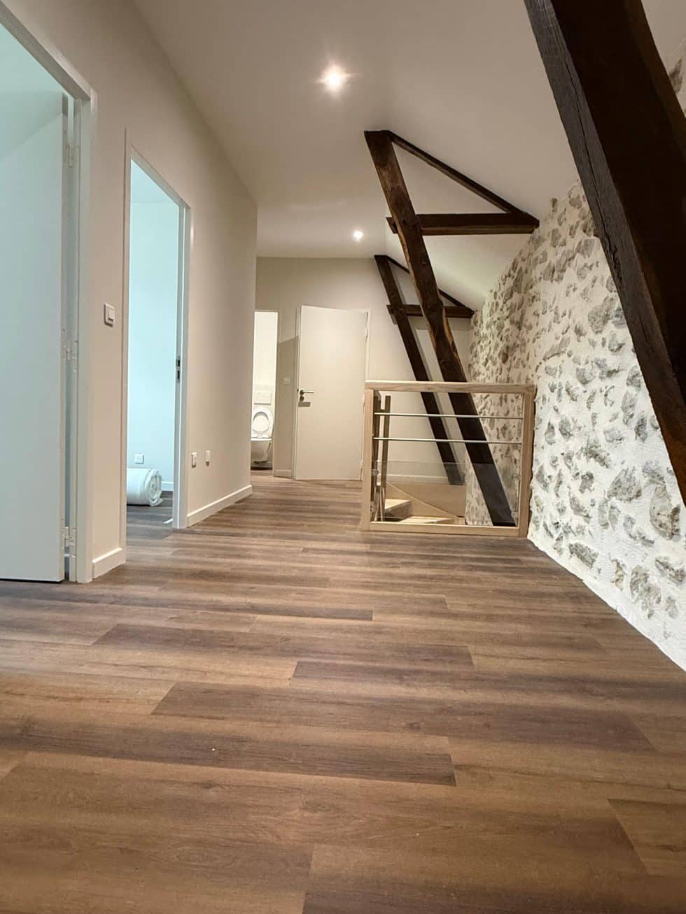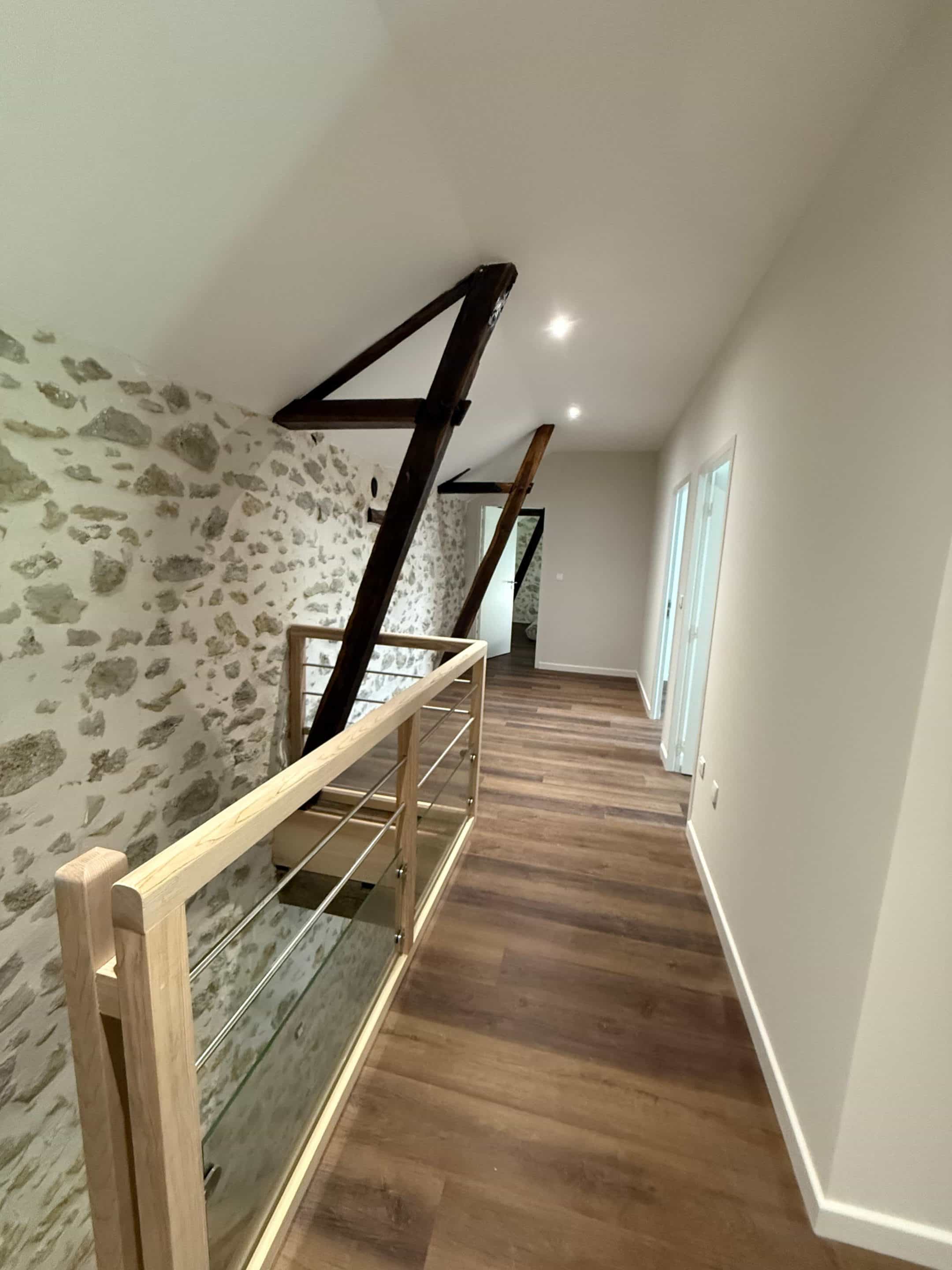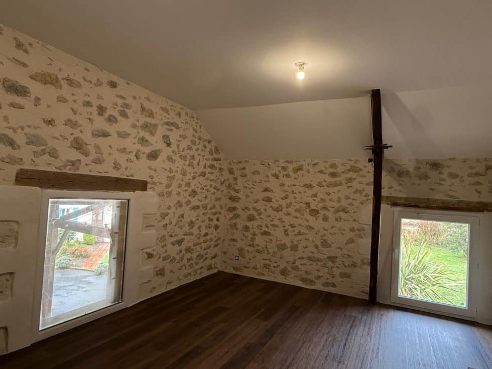 Poutres en bois massif apparentes et murs en pierre brute sont sublimés, contrastant avec les surfaces placo lisses peintes en blanc pour une harmonie parfaite entre tradition et modernité.