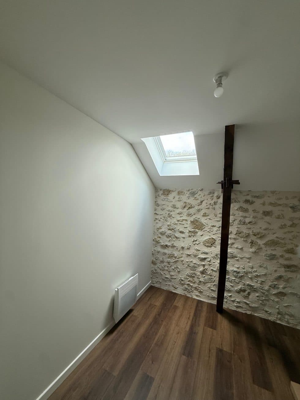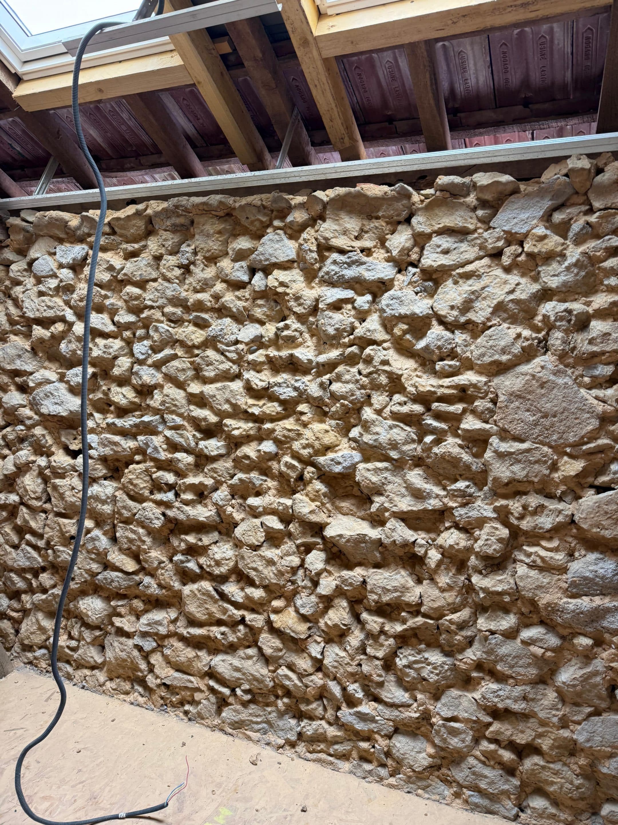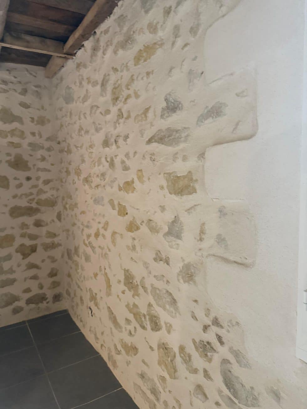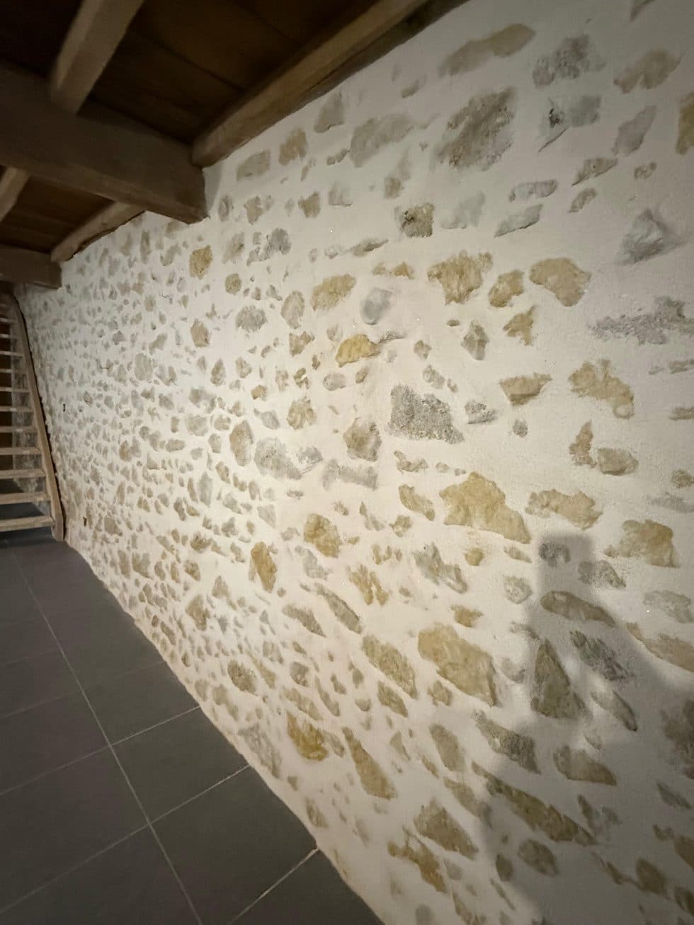 Poutres en bois massif apparentes et murs en pierre brute sont sublimés, contrastant avec les surfaces placo lisses peintes en blanc pour une harmonie parfaite entre tradition et modernité.