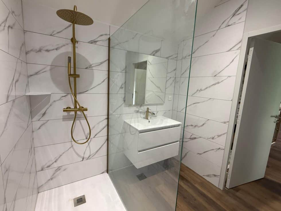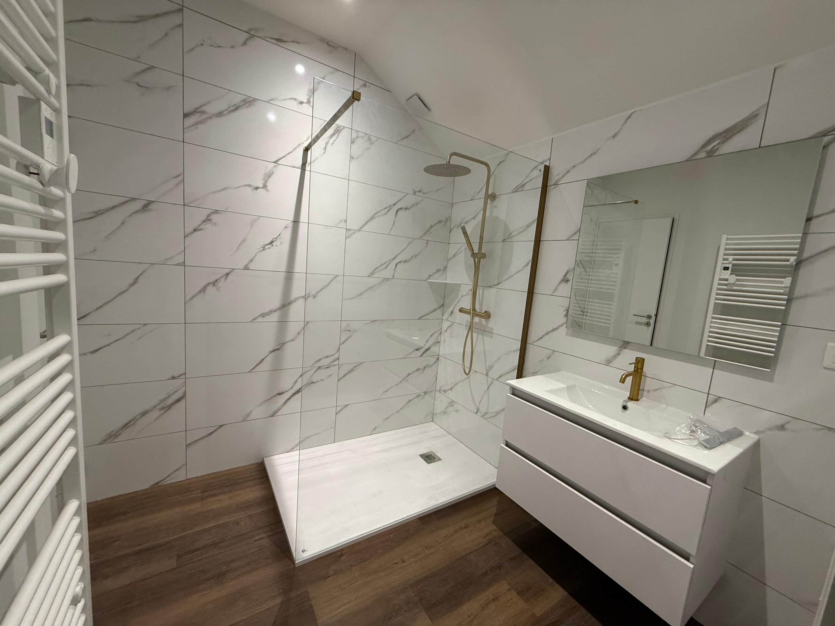 Résultat final : une salle de bain premium avec douche italienne carrelage marbre, vasque suspendue et robinetterie dorée, baignée de lumière naturelle par Velux.